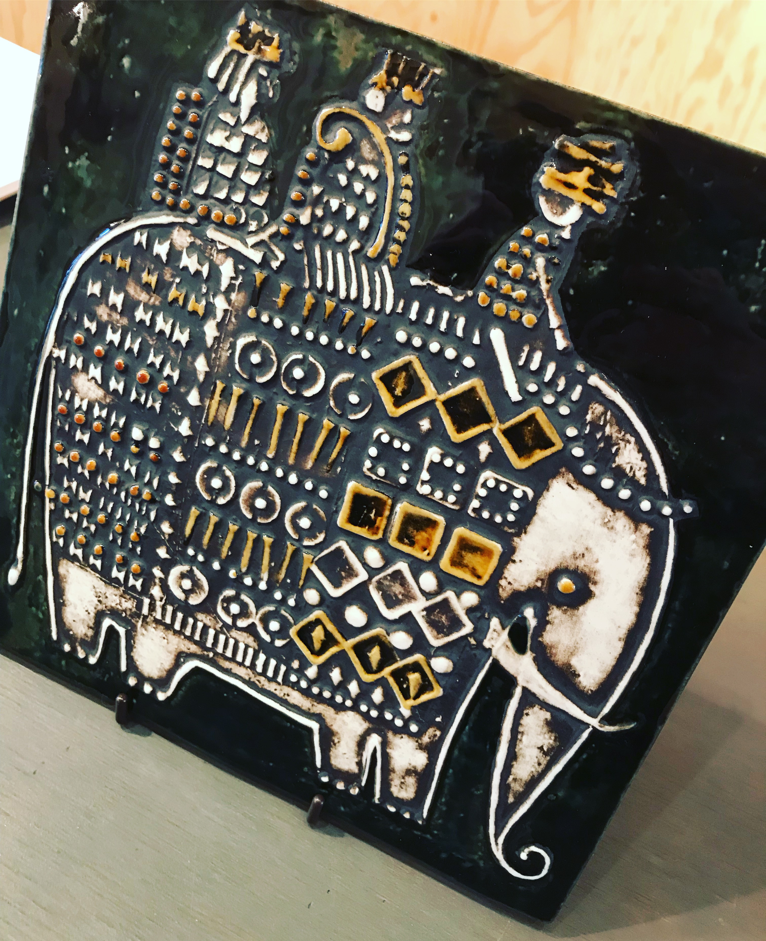 リサラーソンのUNIKシリーズの象の陶板。背景のカラーが深緑で綺麗な釉薬をかけられています。あまりに綺麗だったので即買いしてしまいました。