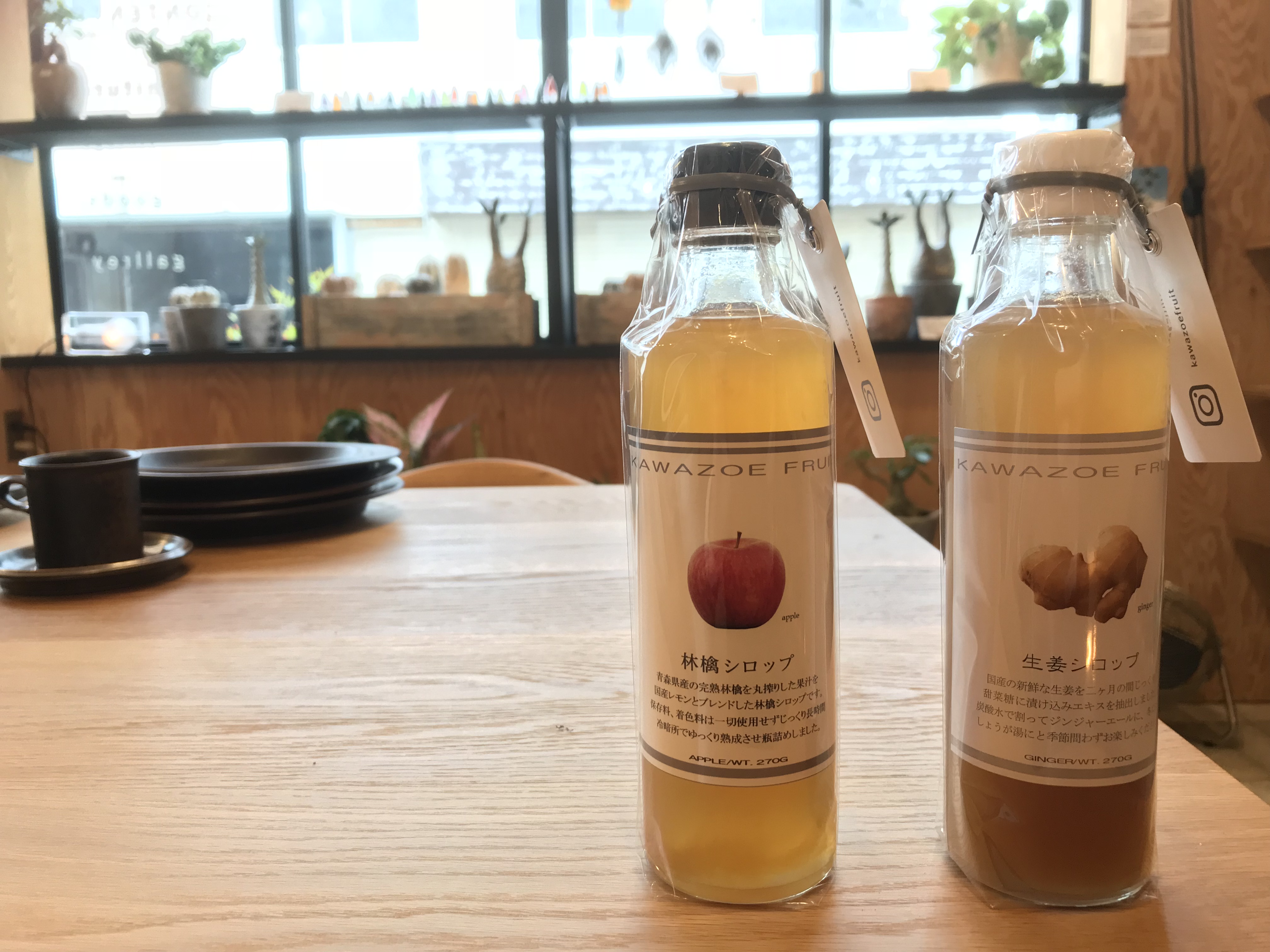 KAWAZOE FRUITの大人気生姜シロップと新作の林檎シロップ。生姜&林檎をあわせてお湯割りにするとさらに美味しいです。
